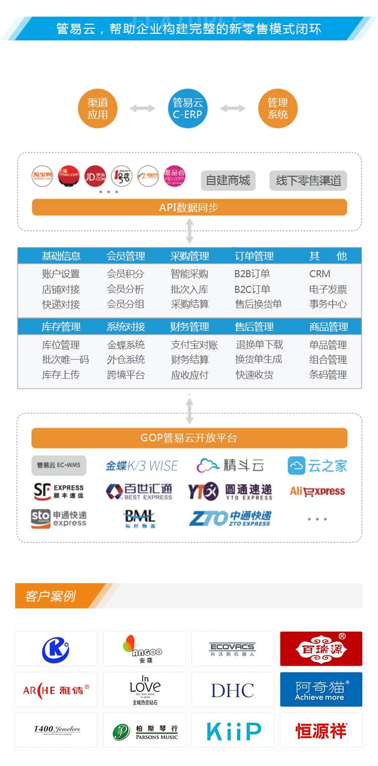 管易云C-ERP是金蝶集团旗下专注提供电商企业管理软件子产品,以SAAS模式打造,快捷方便,简单易操作。软件以订单为中心,为电商各行业类目的客户提供明确的模块化协同操作,提供采购、库存、售后及财务等环节的管控,帮助客户提升业务处理能力及行业竞争力。是为中小型电商企业量身定制的整体性解决方案。